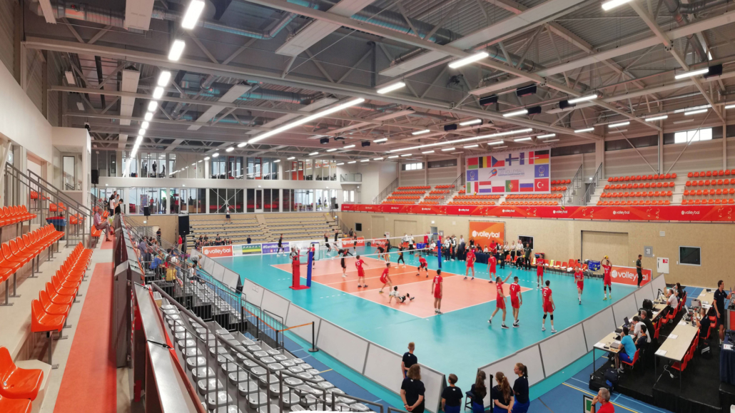 The sports campus consists of individual recognizable buildings on a campus. Sport is an important connecting factor on the campus. There is an axis of activity through the building to the underlying terrain. The hospitality industry is part of this axis. A beach volleyball court, obstacle course and the stairs as fitness track are part of the outdoor program. Visitors are encouraged to move.