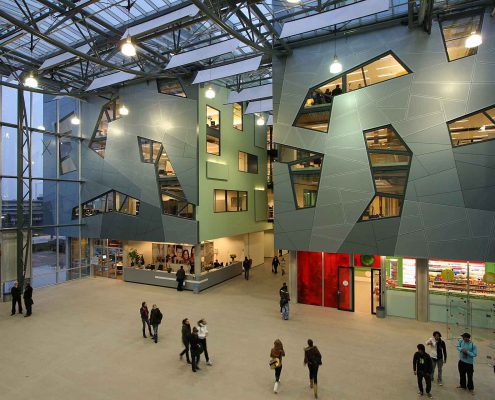 The new building for Vocational Education Centre Nijmegen, location Carolus, accommodating the sectors Economics and Health and Welfare, is located next to the central train station of Nijmegen. This remarkable location, embedded in between the train tracks and bus lane, accommodates educational facilities shaped like a shopping mall around large, glass roofed plaza. The outstanding facades created a sense of unity in the complex. Despite the seemingly wide variety, the facade is created out of repetitive parts.